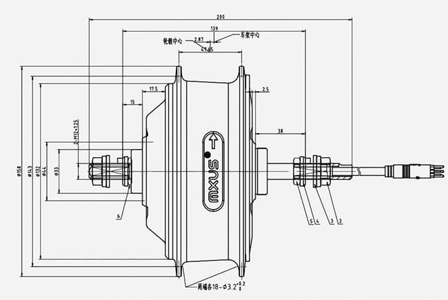 Мотор под трещотку устанавливается на зад и имеет расстояние между дропаутами 135мм. Он рассчитан на скорость 35-45км/час в зависимости от напряжения, диаметра обода и нагрузки. Имеется крепление под дисковый тормоз.