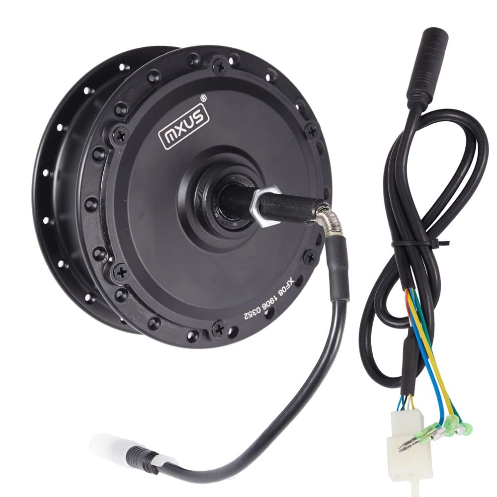 Мотор-колесо MXUS XF08 имеет встроенный понижающий планетарный редуктор с обгонной муфтой, за счет чего обладает хорошим крутящим моментом, а при движении накатом не создает сопротивления движению. Для управления мотором необходим контроллер для бесколлекторных двигателей на максимальную силу тока до 18А. Для подключения используется 3 фазных провода и 5 проводов от датчиков Холла (2 провода - питание, 3 - сигнальные).