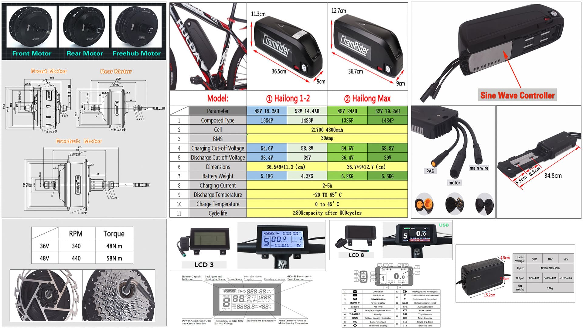 | Типы мотора - установка: | Front Motor - переднее колесо Rear Motor - заднее под трещотку Freehub Motor - заднее под кассету по запросу - под трещотку / кассету (Freehub) крепление для тормозного ротора есть |