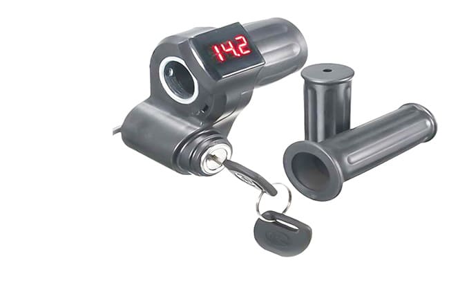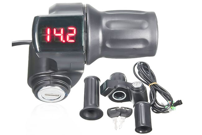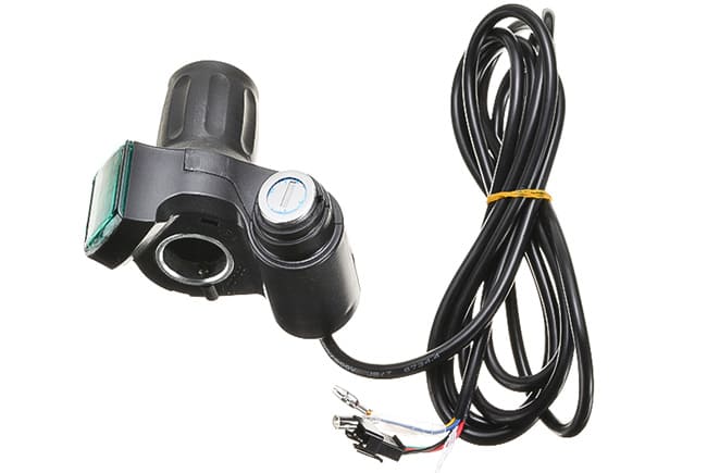Половинчатая ручка газа с ключом и вольтметром для электровелосипеда, электросамоката, электромопеда, электроскутера. Подходит для стандартных контроллеров управления бесколлеторными моторами, мотор-колесами, коллекторными моторами. Взаимозаменяема с ручками газа в основе конструкции которых лежит датчик Холла.