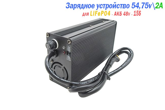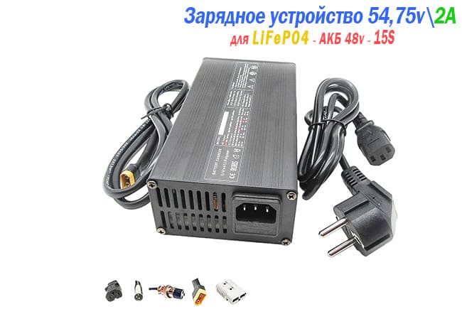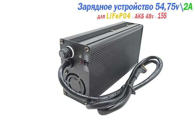 Зарядное устройство для LiFePO4, LFP . Это зарядное устройство имеет выходное напряжение 54,75 V с током заряда 2A подходит для сборок LiFePO4 - 15S. Стоимость: Зарядное устройство для АКБ LiFePo4 15S output 54,75V 2A на данный момент 2506 руб. Принцип заряда CC/CV