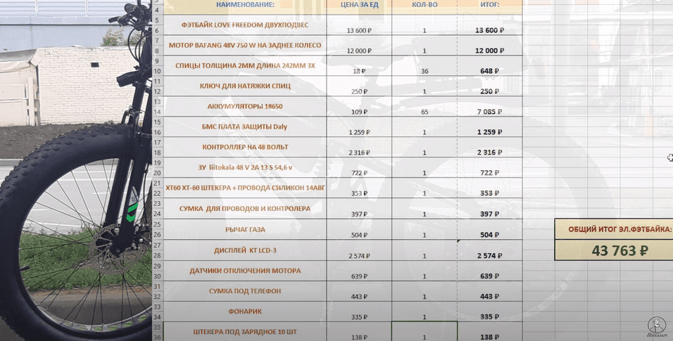 ⬇ Затраты на сборку электрофэтбайка: