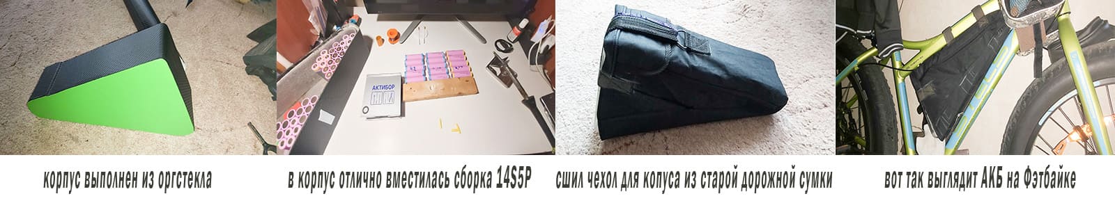 Так как изначально аккумуляторная батарея у меня была расположена на багажнике и это было не очень удобно и выглядело странно, я собрал корпус под АКБ в треугольник рамы и разместил его в чехле, который сшил из прочной ткани от старой дорожной сумки.