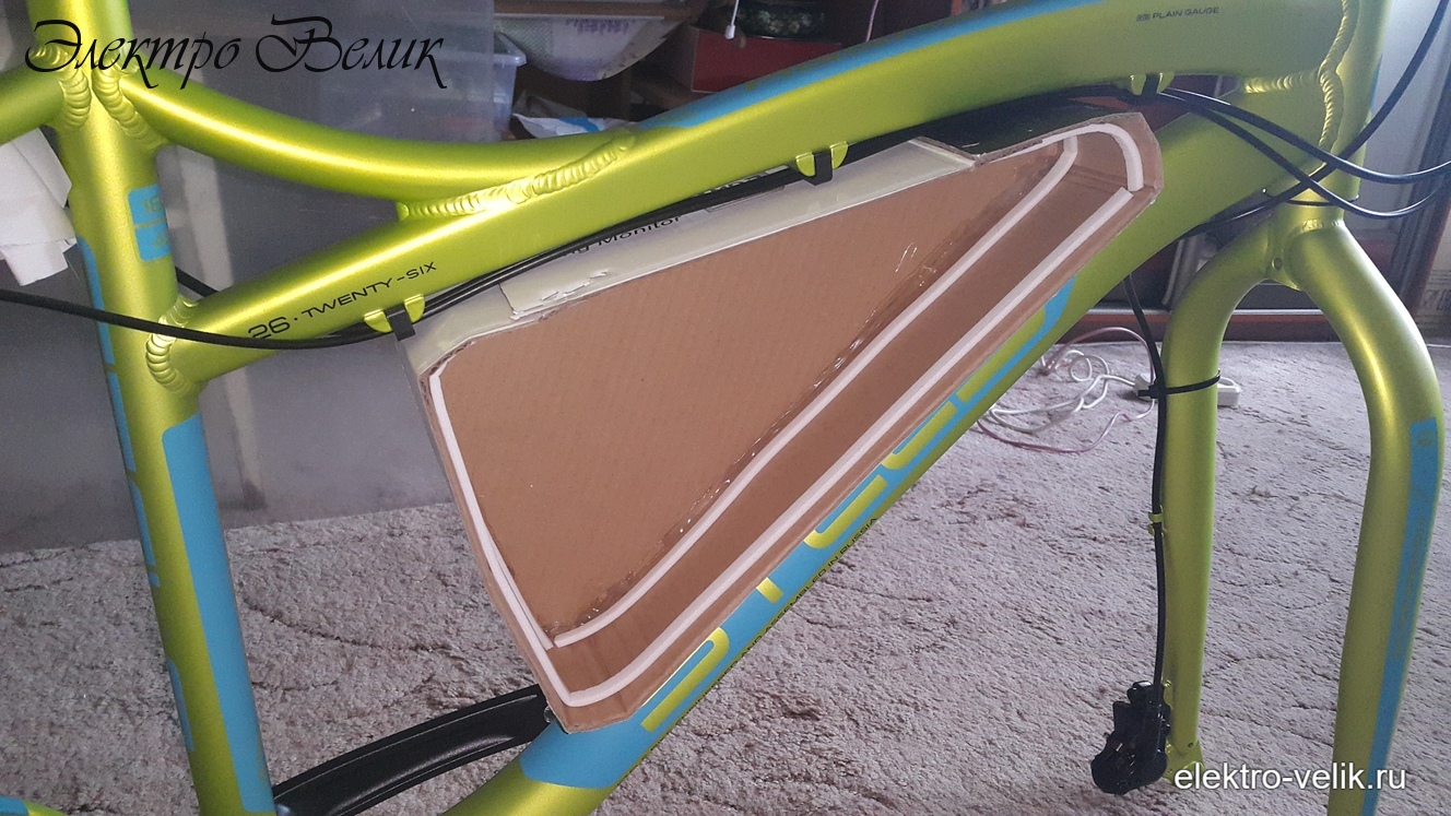 Надоели мне громоздкие аккумуляторы на багажнике и в этот раз я решил собрать корпус аккумулятора для электровелосипеда и расположить его в раме, так как рама у меня не совсем треугольная и вымерить размеры будет сложно я решил сделать образец формы из плотного картона, он легко гнётся и можно сформировать форму учитывая все изгибы рамы.