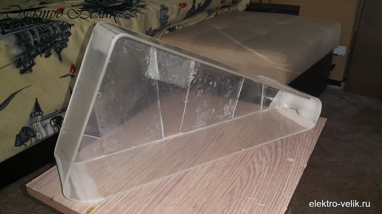 Далее я вырезал из оргстекла нижнюю стенку корпуса, вырезал так что бы она вошла внутрь треугольника корпуса, для прочности я нарезал две широкие полосы и склеил все клеем секунда с содой, а после застывания промазал слоем эпоксидной смолы, сначала планировал для большей прочности обклеить корпус изнутри стекловолокном, но потом отказался от этой идеи так как при нарезании разлетаются мелкие частицы стекловолокна и создают дискомфорт в виде зуда на коже.