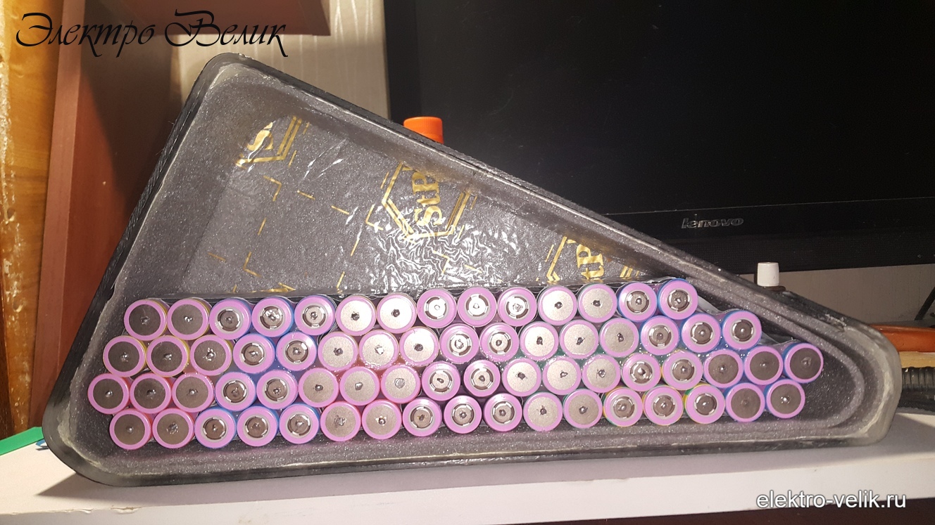 На фото видно, как я расположил секции аккумуляторной батареи в каждой секции по 5 элементов сейчас уложено 13 секций и остаётся вместить ещё одну как видно в корпусе достаточно места и при желании в дальнейшем можно будет добавить, например, 14 элементов или одну секцию. Подробно про сборку аккумуляторной батареи перейдите по ссылке - Сборка аккумуляторной батареи для фэтбайка.