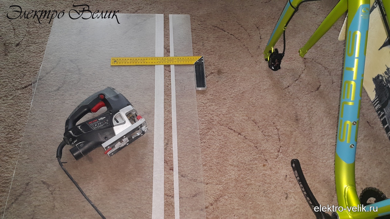 Корпус для аккумуляторной батареи электровелосипеда я решил сделать из оргстекла толщиной 4 мм. Раскроил лист согласно шаблону из картона. Сначала я отрезал полосу шириной 90 мм, так как длина аккумуляторов 18650 составляет 65мм плюс будут напаиваться силовые провода и должен остаться зазор с двух сторон для прокладки защитного эластичного слоя.