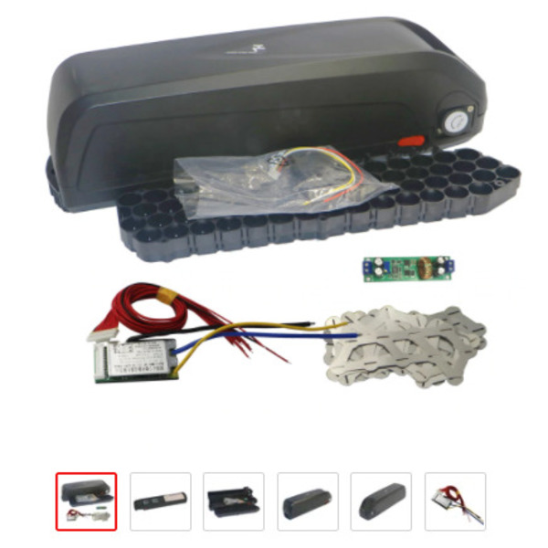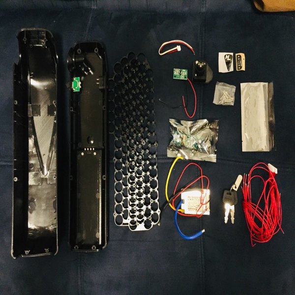 В комплекте - плата защиты BMS на 15 или 30 ампер, держатели для элементов 18650 в количестве 65 отсеков, никелевые пластины для соединения секций, ключи для снятия аккумуляторной батареи с рамы, так же на корпусе расположен включатель/выключатель выхода подачи напряжения для включения электровелосипеда.