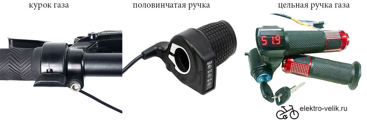 Для управления скоростью электровелосипеда понадобится один из вариантов таких как курок газа – компактный и удобный в управлении. Ручка цельная – работает по типу мотоциклетной, но при езде по бездорожью бывают неудобства в управлении самим велосипедом, половинчатая ручка – более удобная в плане управления велосипедом, но при длительной поездке по бездорожью за счёт неравномерной нагрузки на кисть создаёт некоторые неудобства. Я для себя выбрал компактный курок газа, который управляется одним большим пальцем.