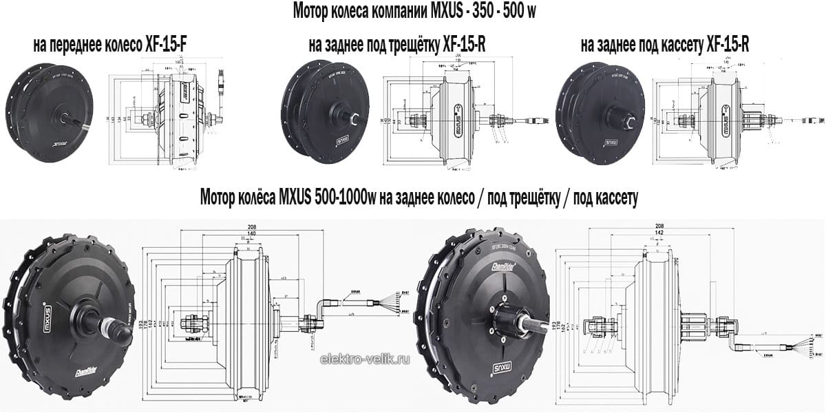Безщеточный мотор на планетарной втулке, бренд MXUS для электровелосипеда на 36 вольт - 350 ватт, 48 вольт - 500 ватт. Есть на переднее колесо с маркировкой XF15F, и на заднее колесо с маркировкой XF15R оба колеса имеют возможность установки дискового тормоза, XF15R на заднее колесо имеет место под трещетку. Я покупал XF15R за 8015 рублей сейчас цена составляет 9000 рублей но может меняться.