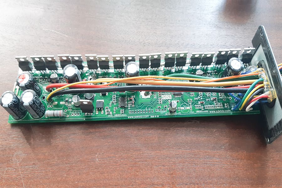 Здесь 18 мосфетов которые поджаты к корпусу для рассеивания нагрева, между корпусом и мосфетами наклеен термостойкий скотч, который предотвращает замыкание, мосфетов по шесть на каждый фазный провод мотора, чем больше мосфетов тем большую силу тока они могут пропустить.