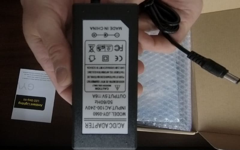 Так же в комплекте идёт мощный блок питания на 5 вольт и 6 ампер который обеспечит стабильную работу 3х метровой адресной светодиодной ленты.