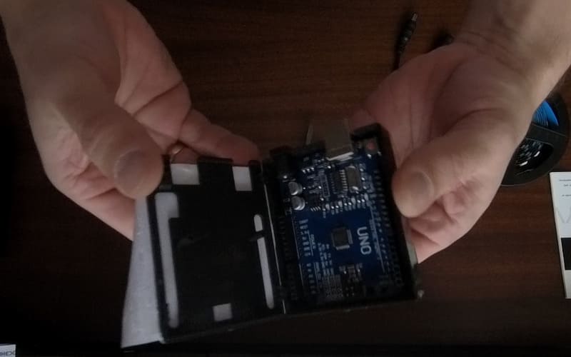 Теперь мне интересно что внутри, это явно не ардуино нано…. Я уже попробовал аккуратно отклеить наклейку, сейчас открою и посмотрим, что внутри… ну вот установлена ардуино уно с чипом мега 328 П стоимость такой ардуины в среднем около 300 рублей… по виду все достаточно аккуратно, корпус изначально изготовлен под эту плату так как есть точные посадочные места под неё.