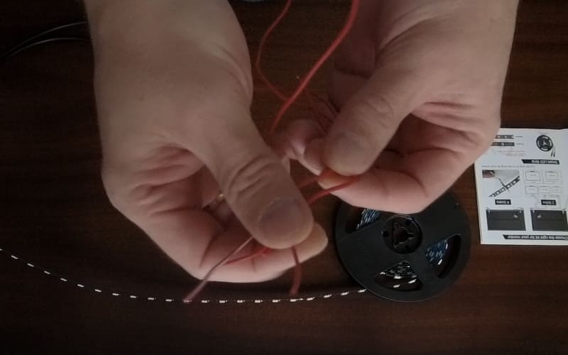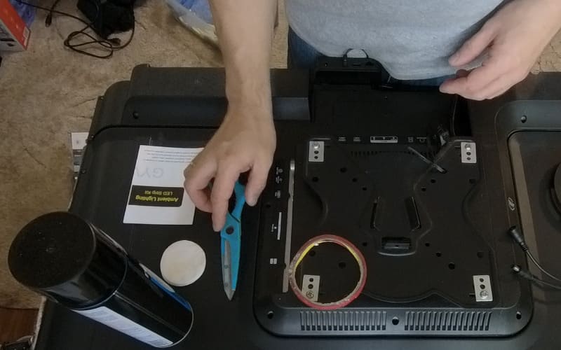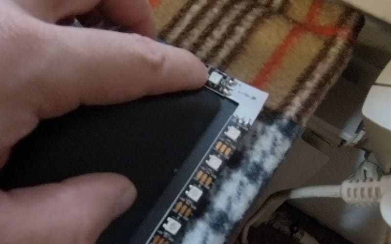 Итак, отмеряем с одной стороны и отрезаем светодиодную ленту по разметке. Тоже самое проделываем с остальными сторонами…