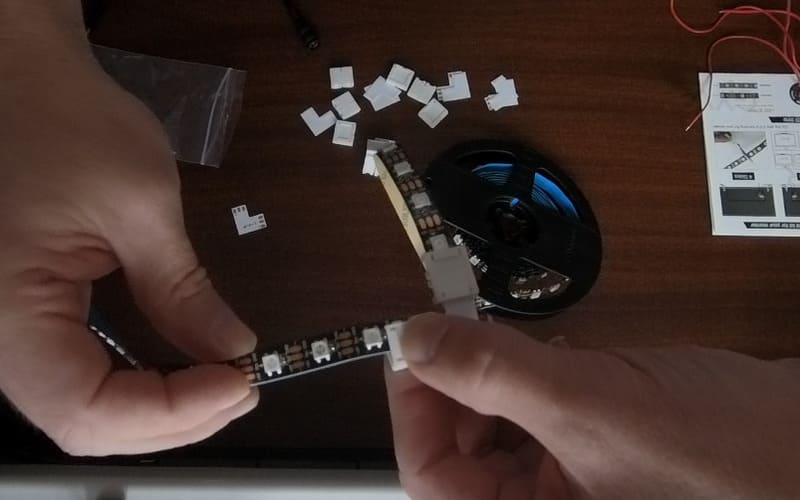 Теперь нужно спаять ленту, я буду спаивать, используя эти контактные уголки, но возможно с проводами получилось бы более компактно… но и менее аккуратно.
