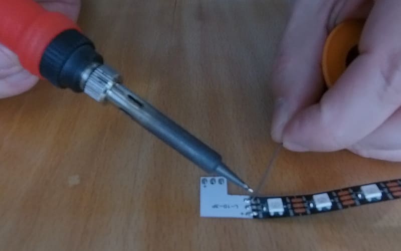 После нарезки ленты по размеру ее нужно спаять при помощи, например, вот таких проводов.