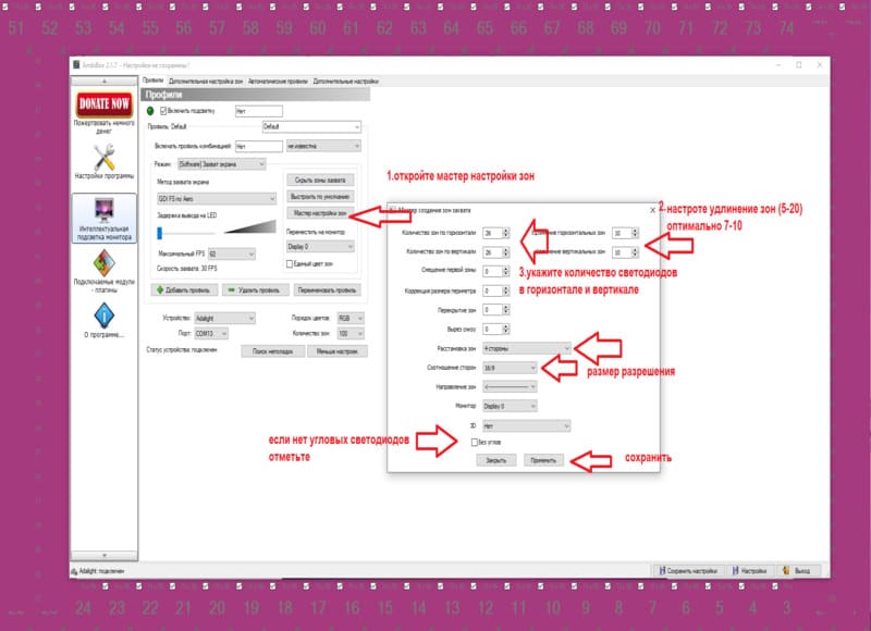 У меня уже установлена бесплатная программа Ambibox выставляем настройки как показано в инструкции, выбираем порт, в который подключили блок управления, и указываем количество светодиодов в ленте у меня 3 метра по 60 светодиодов на метр соответственно должно быть 180 поэтому я ставлю 180… программа перезагружается, и подсветка включается… отлично