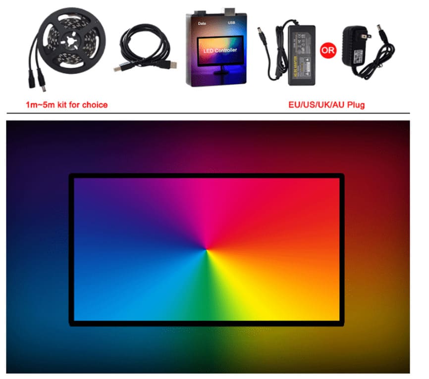 Цена за комплект как у меня лента 3 метра и 60 светодиодов на погонный метр. Универсальный комплект для подсветки монитора или телевизора. Данное решение только через подключение к ПК и управление программами Ambibox или Призматик. Просто устанавливается и настраивается. Для установки ленты нужно ее нарезать согласно размерам монитора или телевизора и спаять ленту согласно инструкции.