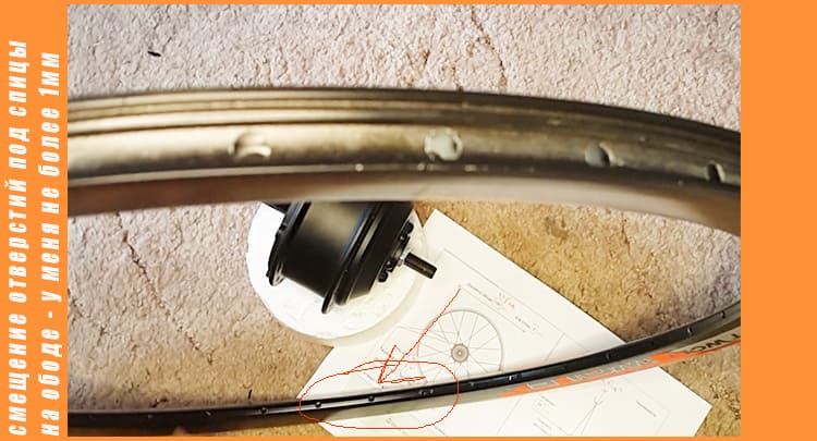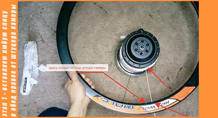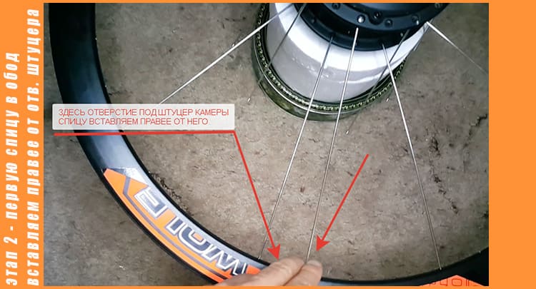 Берём обод находим отверстие под штуцер велосипедной камеры, и вставляем любую первую спицу, которая продета в моторе, правее от отверстия под штуцер, в первое отверстие под спицу, наживляем грибовидный ниппель на 2-3 оборота, а следующую спицу вставляем уже через три отверстия под спицы в четвёртое, и так продеваем все 9 спиц в обод, через 3 отверстия в четвёртое и также наживляем ниппеля на 2-3 оборота. Заспицовывать можно в любом направлении главное через 3 отверстия в четвёртое.