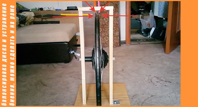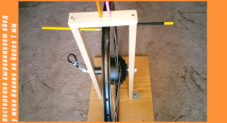 Сейчас нужно выровнять колесо, и по максимуму устранить биение колеса. Для этого я из бруска собрал вот такую конструкцию, но в целом это можно сделать и на раме велосипеда.