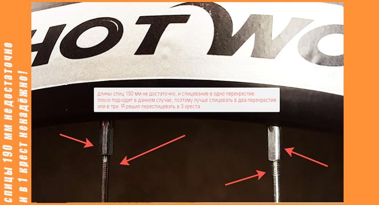 Длину спиц можно корректировать +- 1 - 2 ммСначала я решил заспицевать мотор в одно перекрестие, это решение было принято, так как у меня уже были спицы длиной 190 мм, но позже я изменил своё решение хоть, и уже набрал спицы на ободе. Во-первых, это не надёжно, и при значительном ударе обода, могут просто отломится ушки на моторе, за счёт того, что спицы недостаточно аммортизируют при спицовке в одно перекрестие, во-вторых длины 190 мм недостаточно, и нипель не закрывает всю резьбу спицы, ведь калькулятор высчитал длину спиц в 193 мм.