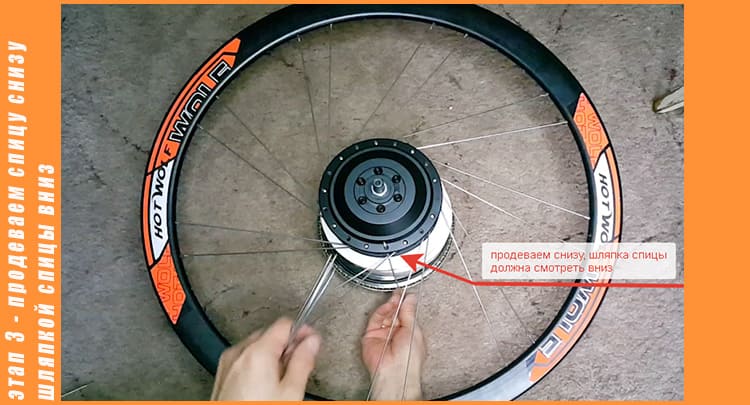 Этап третий - Переворачиваем колесо, и теперь нужно провернуть мотор в лево до упора всех продетых спиц в обод, так как у меня двойной обод, ниппеля спиц цепляются, нужно сделать так что бы они все прошли и были до упора в нижней кромке обода.