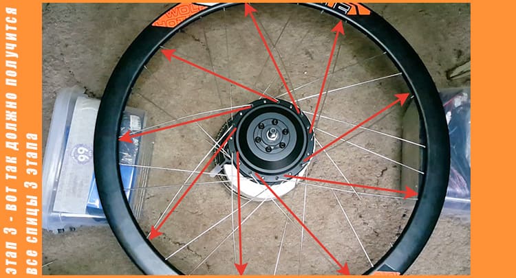 Спицуем мотор в колесо в три перекрестия: