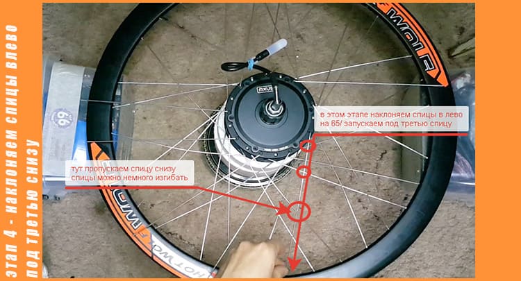 Этап четвёртый заключительный - Переворачиваем колесо, берём 9 спиц, также, как и в третьем этапе вставляем спицы снизу мотора, шляпкой вниз, сейчас в моторе осталось только 9 отверстий в них и продеваем оставшиеся 9 спиц, теперь берём любую спицу, наклоняем влево, и также, как и в третьем этапе над двумя проводим сверху, а под третью запускаем спицу и вставляем в отверстие в ободе, накручиваем ниппель на 2 – 3 оборота, все тоже самое проделываем с остальными.